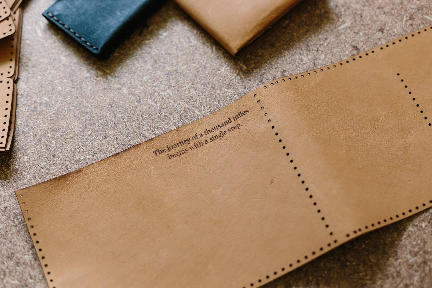 A wallet design usually starts with a passing idea which I will marinate on for a while. Once I figure it out to a certain extent, I will then draw it up on Adobe Illustrator so I can see a blue print-like exploded view in front of me. I will then fine tune the details on the computer before I get a prototype cut using a laser. When the pieces have been cut out, I stitch them together using waxed thread. If there is anything that needs to be changed, I will rethink and start the process again. This usually happens a few times...I'm always thinking of ways to improve things.